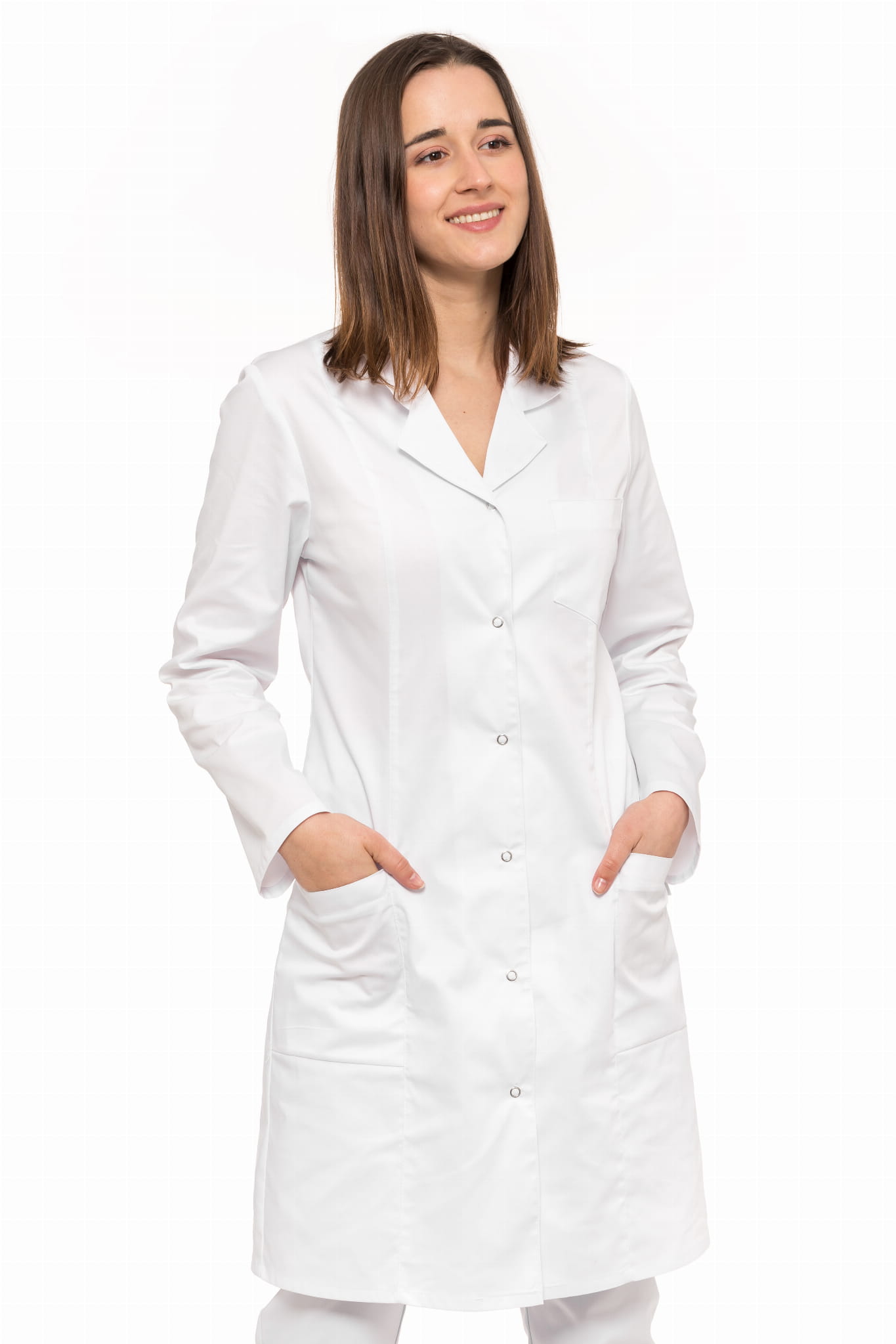 Fartuch medyczny damski Zoja to klasyczny, wygodny model o lekko dopasowanym kroju z pionowymi cięciami. Ma wykładany kołnierz, zapięcie na napy oraz trzy pojemne kieszenie na niezbędne akcesoria. Szyjemy we własnej szwalni – możesz wybrać kolor i długość rękawa oraz dodać haft (logo lub personalizację).