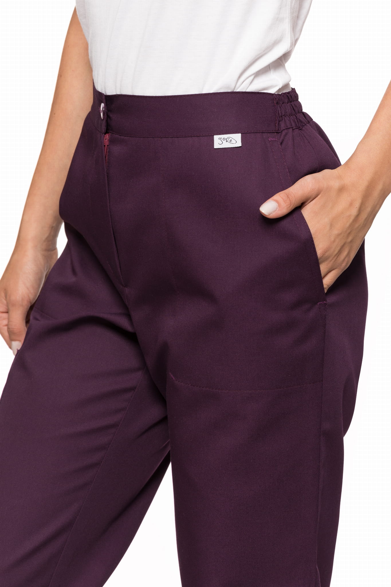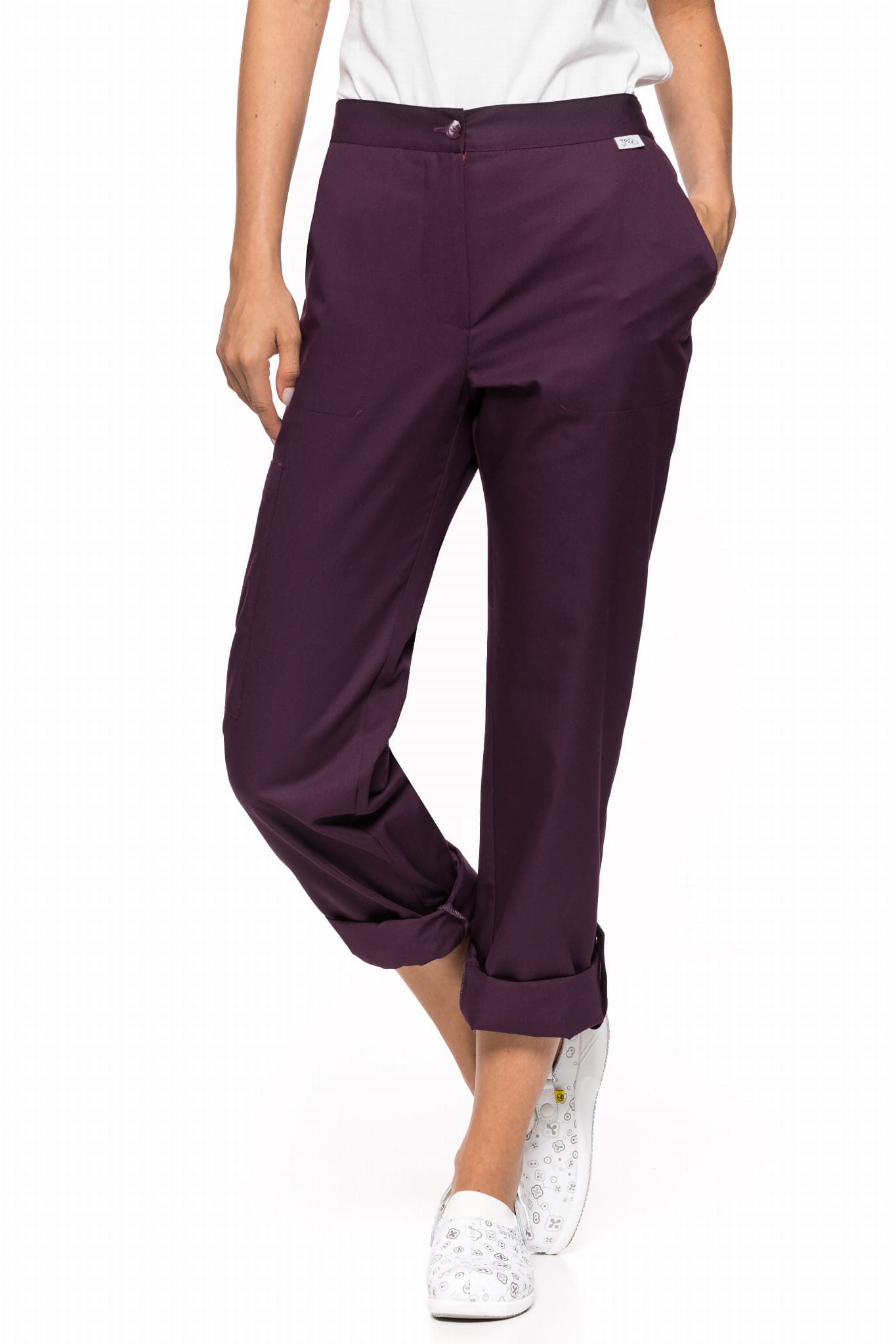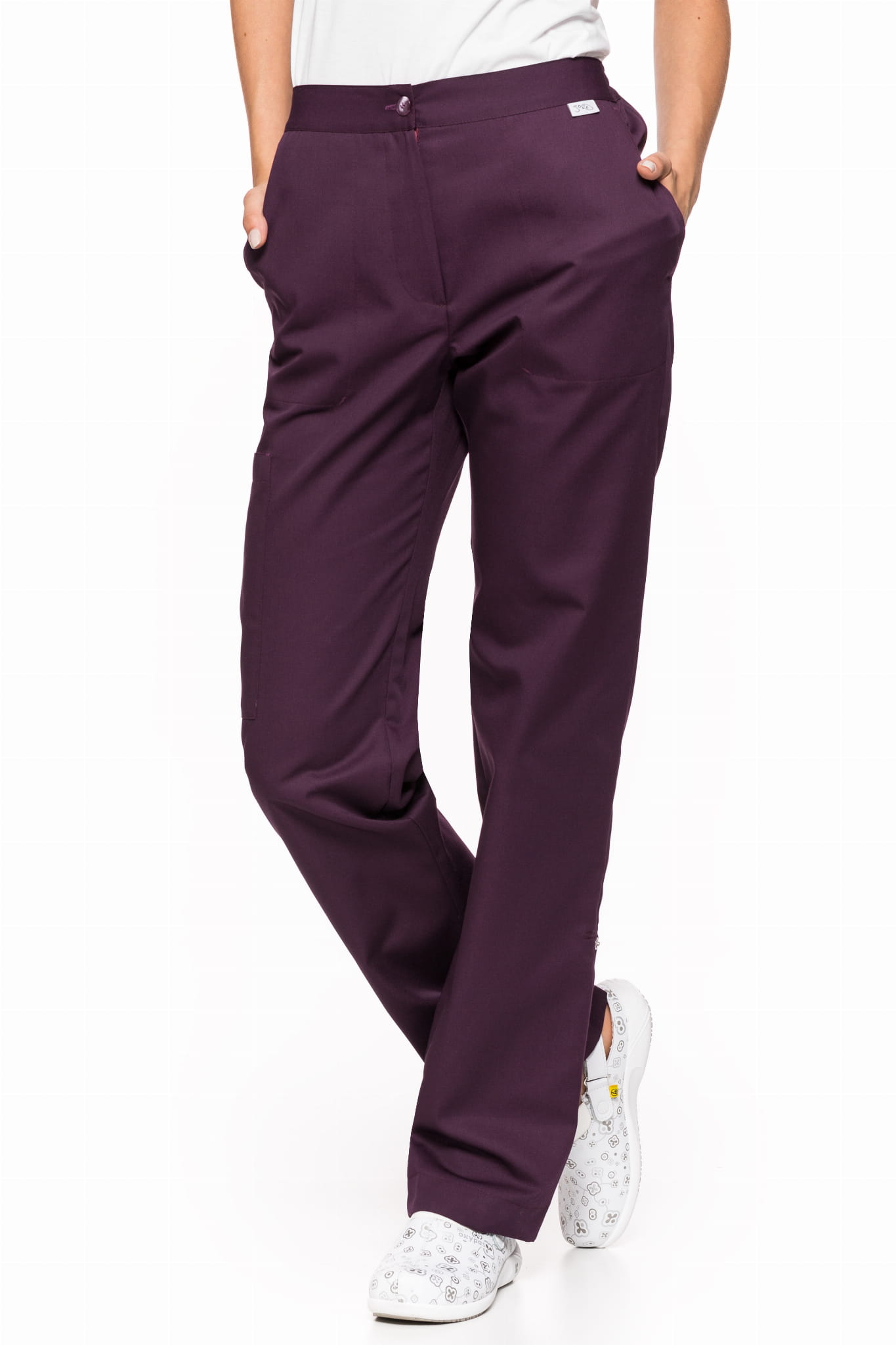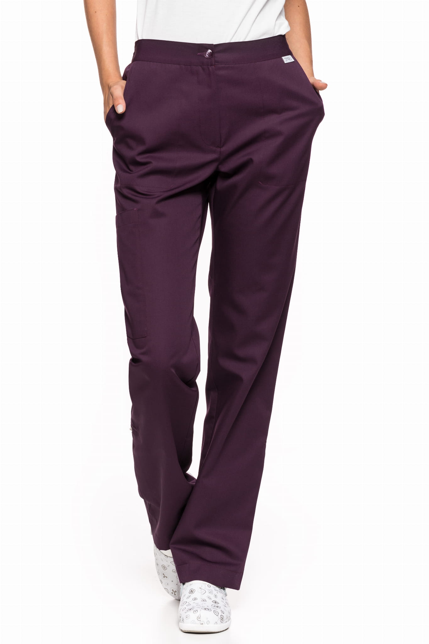 Spodnie medyczne damskie 010 to model o prostym kroju, który łączy klasyczny wygląd z funkcjonalnością. Dwie wpuszczane kieszenie oraz dodatkowa kieszeń naszyta na prawym udzie pozwalają na wygodne przechowywanie niezbędnych akcesoriów.