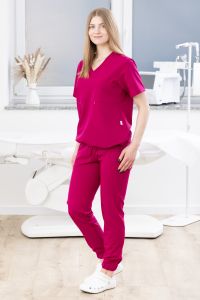 Poczuj niezrównany komfort i nowoczesny styl w pracy! Ta luźna bluza medyczna damska w kolorze [Amarantowym] to połączenie swobody ruchów z funkcjonalnością. Posiada elegancki dekolt w serek, szeroko wszyte rękawy, klasyczną górną kieszeń oraz dwie pojemne dolne kieszenie zapinane na bezpieczne suwaki. Dół wykończony tunelem z wciągniętą gumką pozwala na idealne dopasowanie. Pamiętaj: oferujemy pełną personalizację – od haftu logo po szycie na miarę.