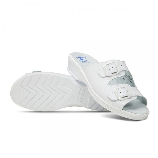 Zapewnij swoim stopom luksus, na jaki zasługują podczas długiego dnia pracy. Te damskie klapki zawodowe łączą w sobie nowoczesny design na 4-centymetrowym koturnie z zaawansowanymi właściwościami ortopedycznymi. Wykonane z najwyższej jakości materiałów, gwarantują nie tylko stabilność, ale i najwyższy standard higieny.