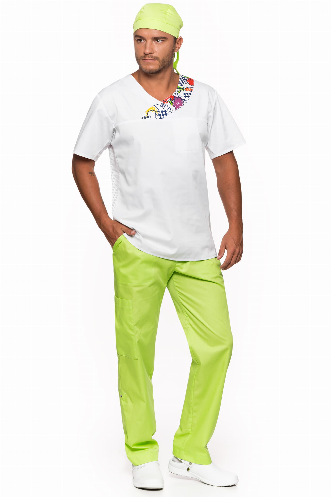 Elegancja spotyka funkcjonalność Model Janek wyróżnia się asymetrycznym zdobieniem przy dekolcie. Kolorowa wstawka dodaje bluzie charakteru, sprawiając, że kucharz prezentuje się nienagannie również w otwartej kuchni (tzw. show cooking) lub podczas rozmów z gośćmi restauracji. Klasyczna biel materiału bazowego podkreśla profesjonalizm i czystość.