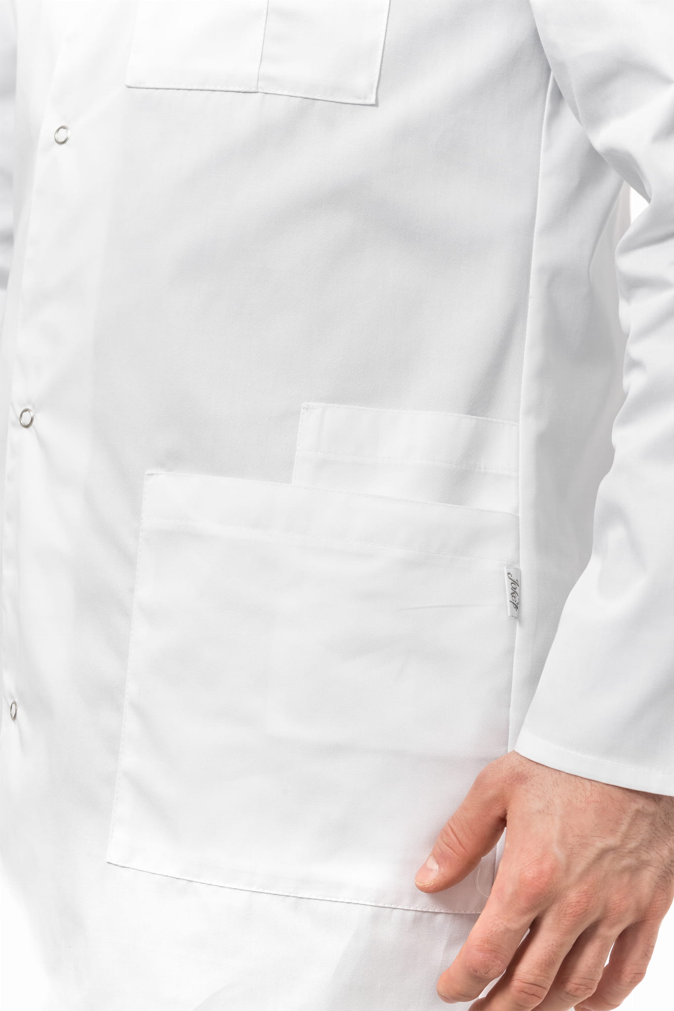 Fartuch wyposażono w aż pięć praktycznych kieszeni: dwie pojemne kieszenie dolne, dwie mniejsze kieszonki oraz podwójną górną kieszeń, idealną na drobne akcesoria medyczne. Standardowa długość modelu wynosi 100 cm, co sprawia, że jest uniwersalnym wyborem do pracy w gabinecie, szpitalu czy laboratorium.
