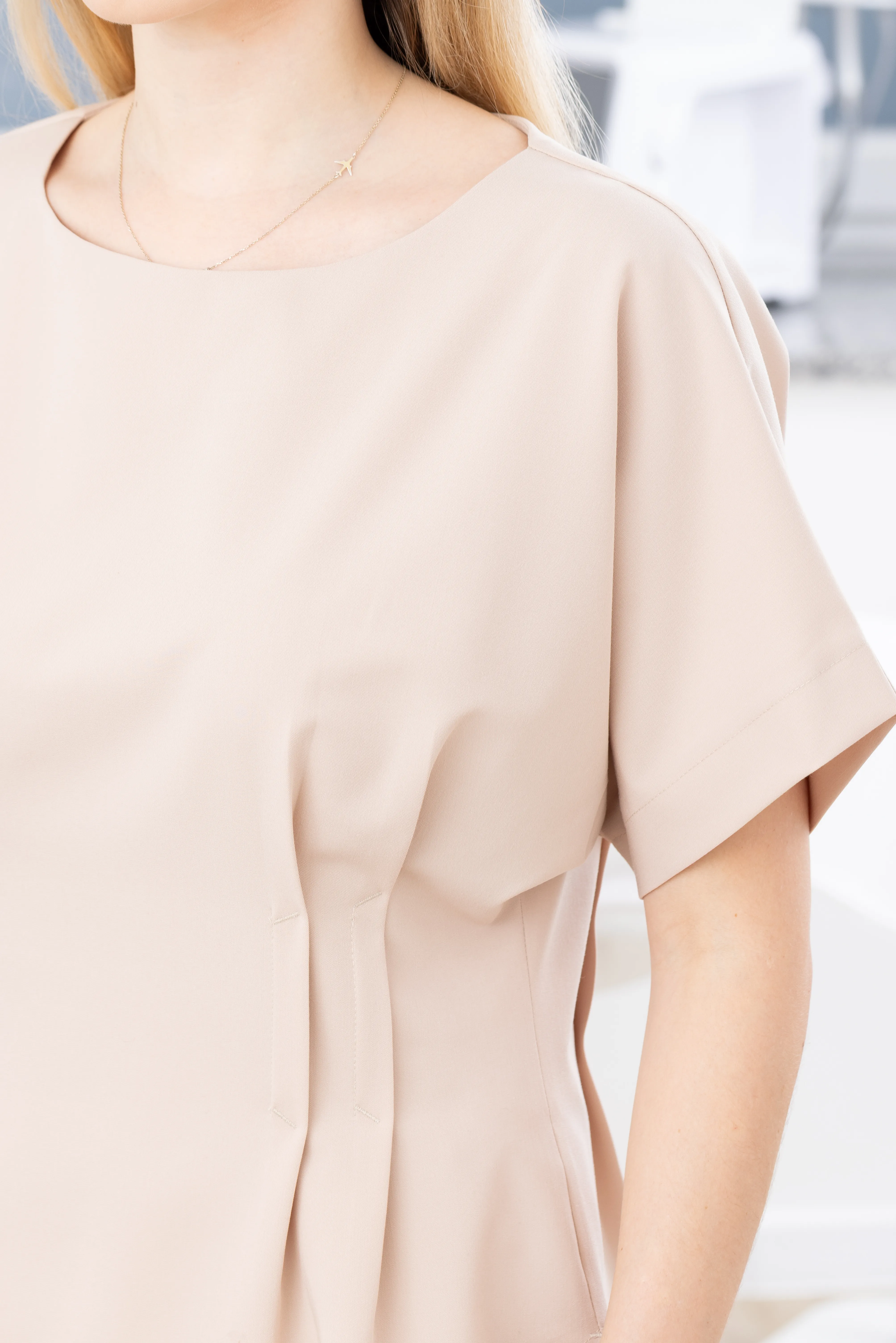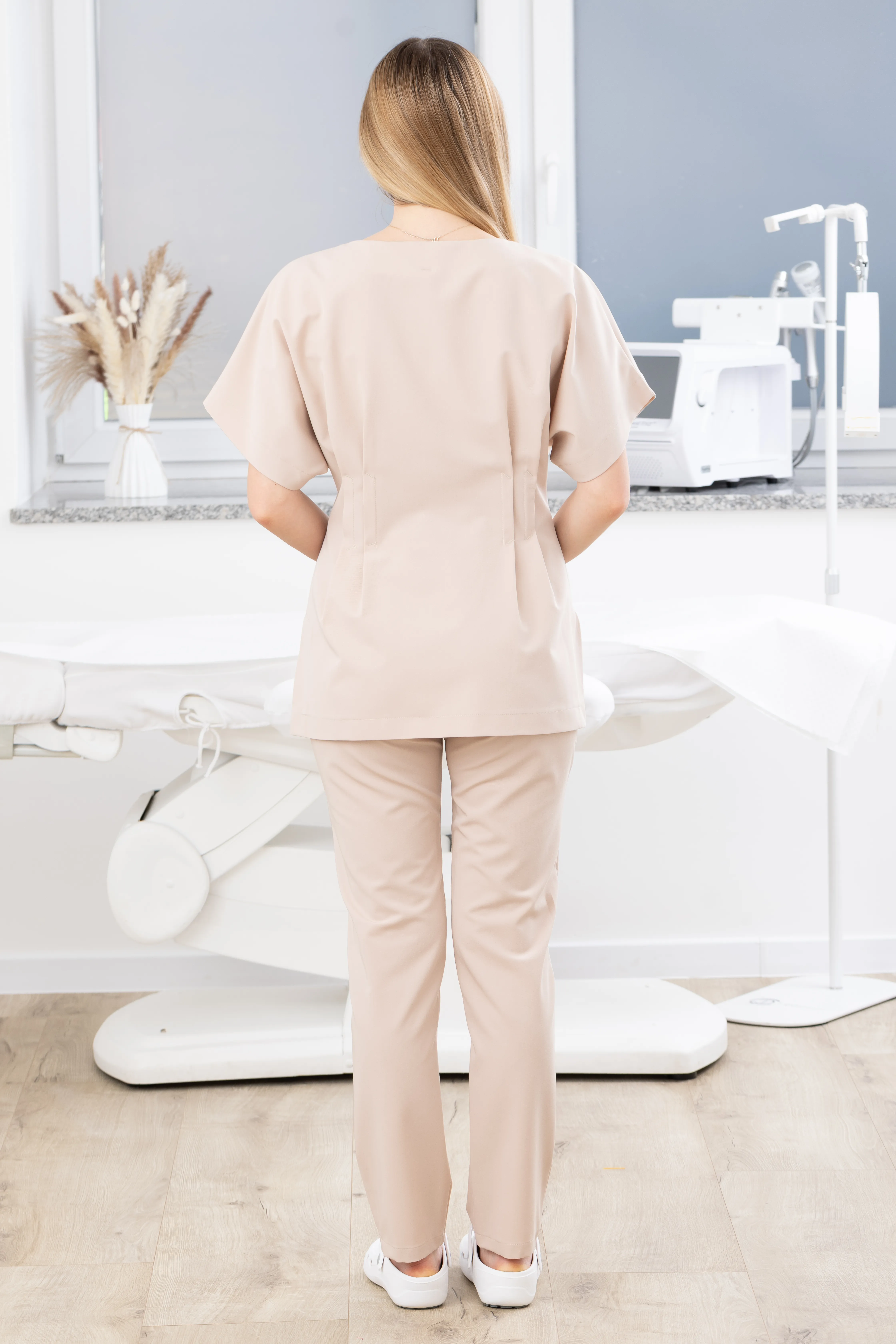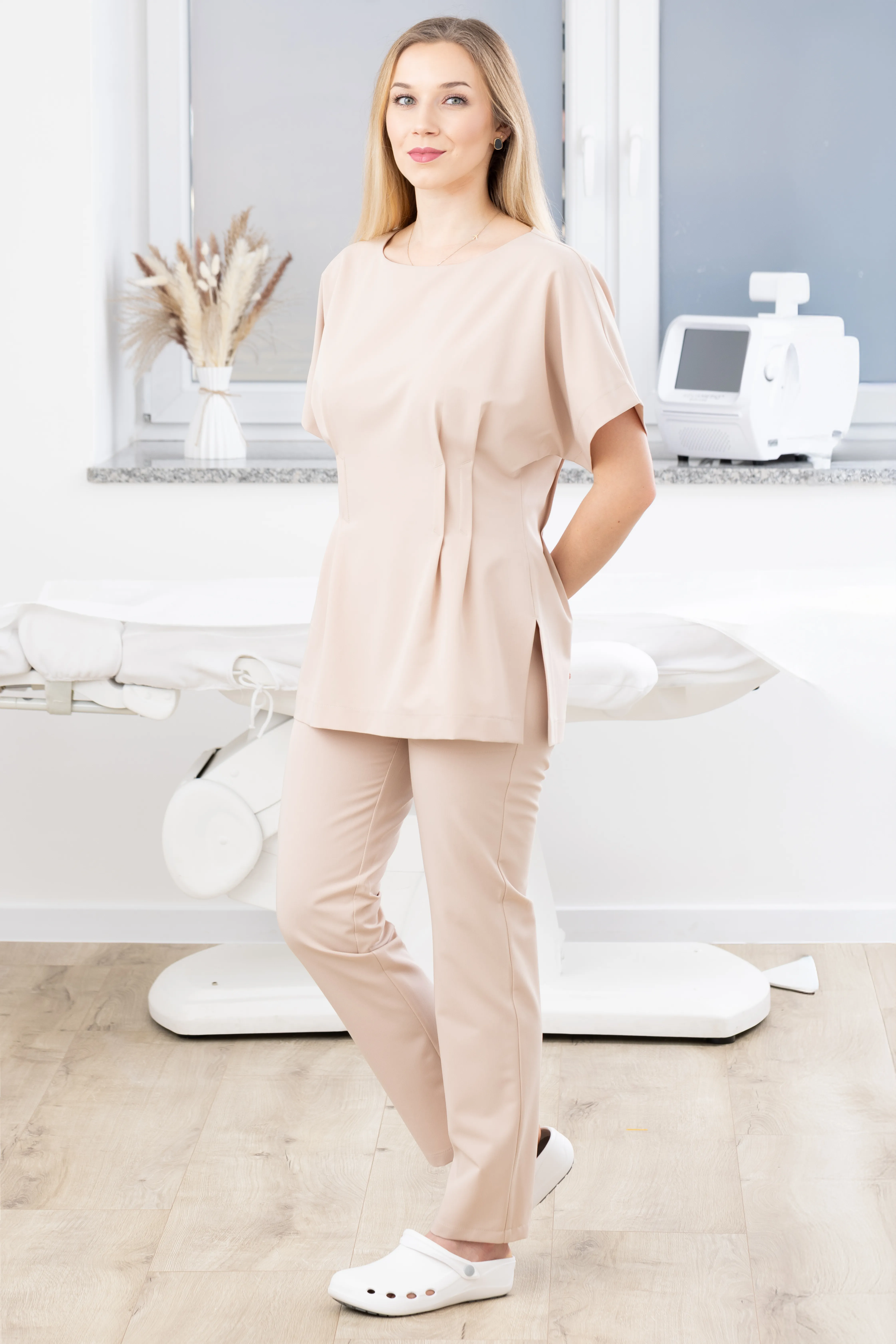 Elegancja spotyka pełną swobodę ruchów. Nasza tunika kosmetyczna Anita o nowoczesnym kroju kimonowym to idealne rozwiązanie dla profesjonalistek ceniących unikalny styl. Dzięki fantazyjnym zaszewkom model pięknie podkreśla talię, zachowując przy tym minimalistyczny charakter (bez kieszeni).