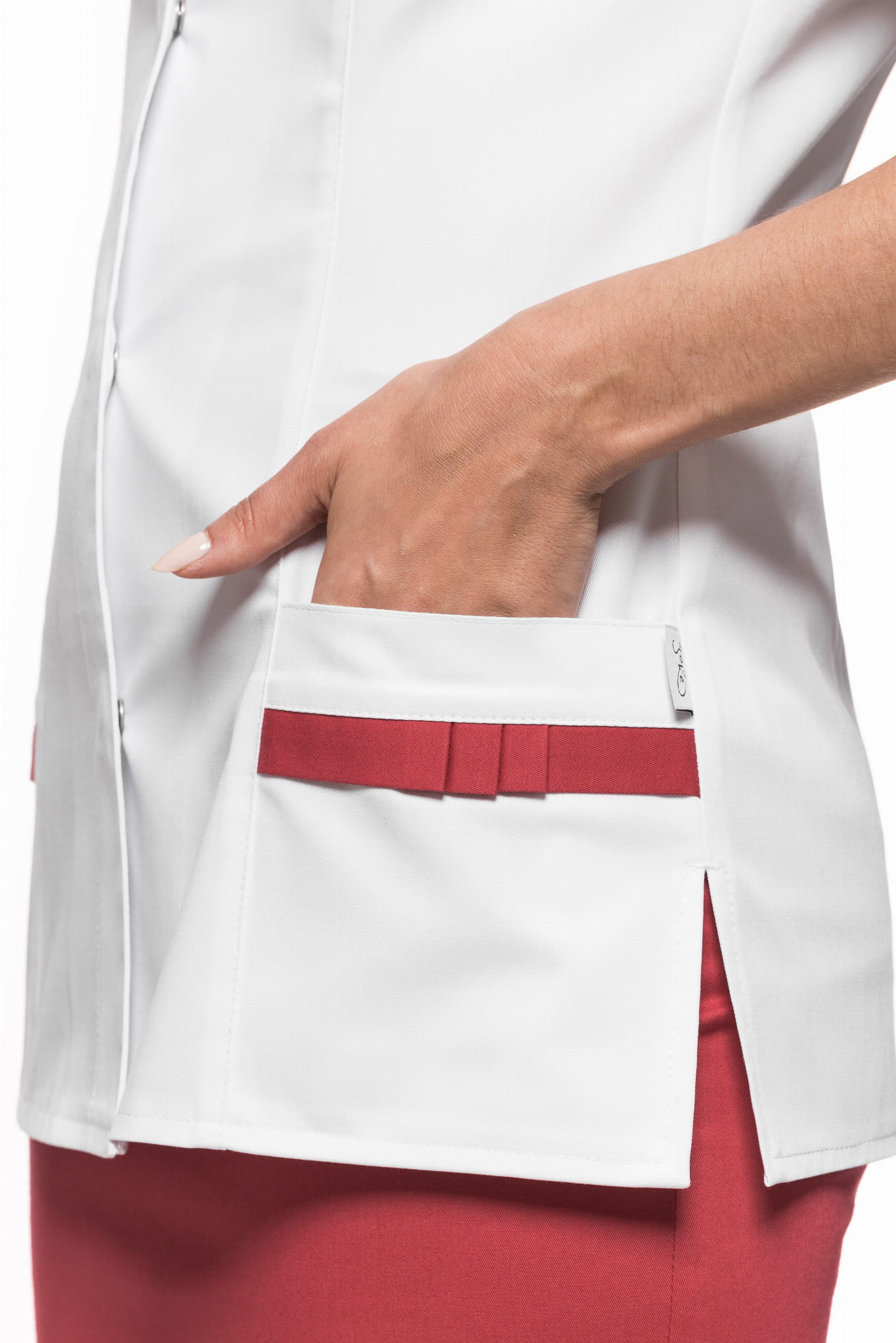 Gracja z Gracją! Żakiet medyczny dopasowany do sylwetki. Uroku dodają ozdobne kontrastowe elementy przy dolnych kieszeniach. Dekolt karo delikatnie podkreśla szyję. Rozcięcia po bokach zapewniają swobodę ruchów. Zapięcie na kryte napy.
